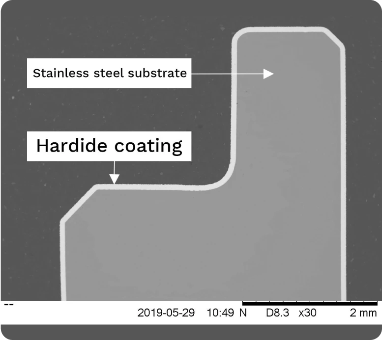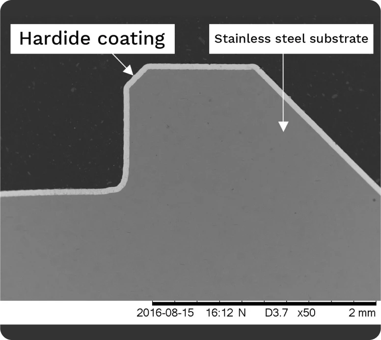 Section of a small steel part with both internal and external corners, uniformly coated with Hardide.