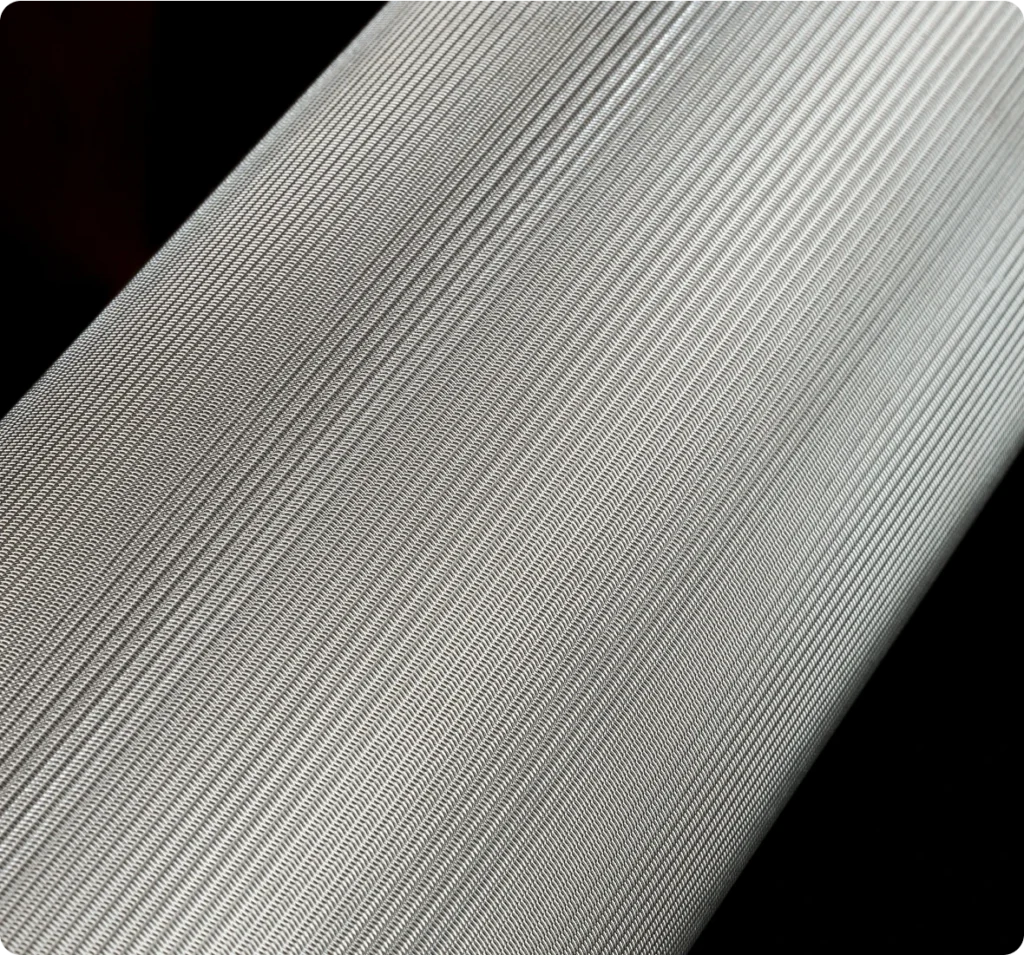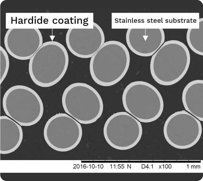 Hardide-coated multilayer woven steel mesh. The coating covers each wire including non-line-of-sight areas.